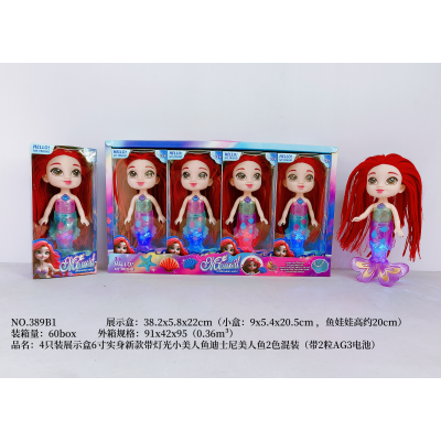 一个展示盒4只装6寸实身新款带灯光小美人鱼迪士尼美人鱼(带2粒AG3电池)