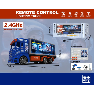 一辆2.4g通过太空 遥控带灯的集装箱卡车, 音乐喷雾(3.7v电池)。 Usb充电线)