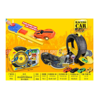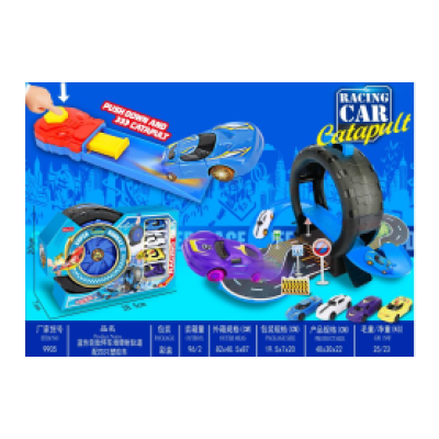 一套黄色轮胎停车场弹射轨道与4辆塑料车